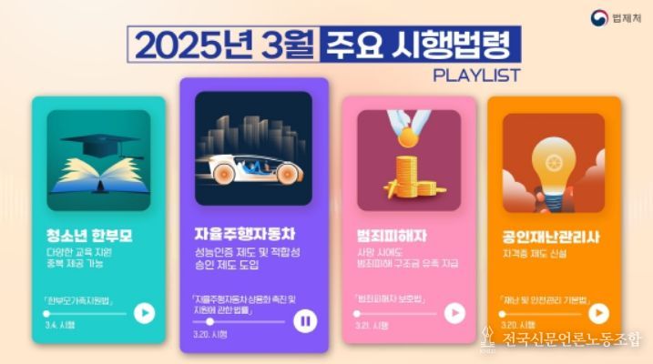 전국신문언론노동조합 관리자 기자 | 3월부터는 자율주행자동차의 성능을 정부가 직접 인증하고, 청소년인 한부모에 대한 학업 지원이 확대된다.