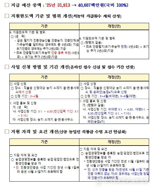 그동안 친환경직불금 지급횟수 산정 시 저농약인증(’16년 폐지) 지급 이력이 포함되어 일부 농가의 직불 참여 기회가 제한되고 신규 인증농가의 직불금 신청 요건이 현실에 맞지 않다는 등의 현장 의견이 제기되어 왔다.