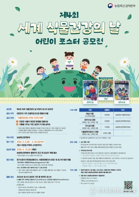 전국신문언론노동조합 강찬희 기자 | 농림축산검역본부(본부장 최정록)는 ‘세계 식물건강의 날’ (5월 12일)을 맞아 전국의 초등학생 및 동 연령대 아동을 대상으로 3월 3일부터 20일까지 3주간 ‘어린이 포스터 공모전’을 개최한다.