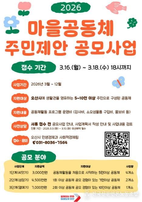 전국신문언론노동조합 김성길 기자 | 오산시는 주민이 주도하는 마을공동체 활동을 지원하기 위해 ‘2026년 오산시 마을공동체 주민제안 공모사업’ 참여자를 모집한다고 밝혔다.