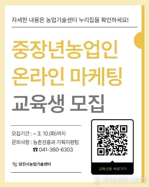 전국신문언론노동조합 강찬희 기자 | 당진시는 농산물 온라인 판로 확대와 디지털 역량 강화를 위해 ‘중장년농업인 온라인 마케팅 교육’ 교육생을 모집한다고 4일 밝혔다.
