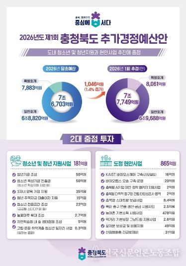 전국신문언론노동조합 강찬희 기자 | 충북도는 도민 체감형 위주의 사업 지원 및 상반기 추진이 시급한 역점사업 추진을 위해 1,046억원 규모의 제1회 추가경정예산안을 3월 3일 충청북도의회에 제출했다.