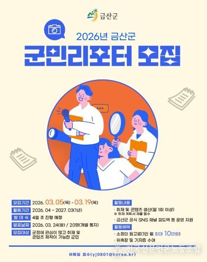 전국신문언론노동조합 강찬희 기자 | 금산군은 군민의 시선으로 지역의 다양한 이야기를 전할 2026년 군민리포터를 공개 모집한다.