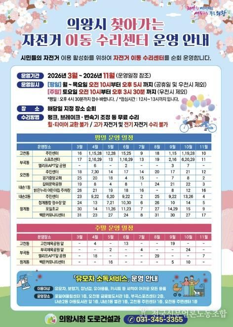전국신문언론노동조합 김성길 기자 | 의왕시가 시민들의 자전거 이용 활성화와 안전한 자전거 문화 확산을 위해 '2026년 찾아가는 자전거 이동 수리센터'를 운영한다.
