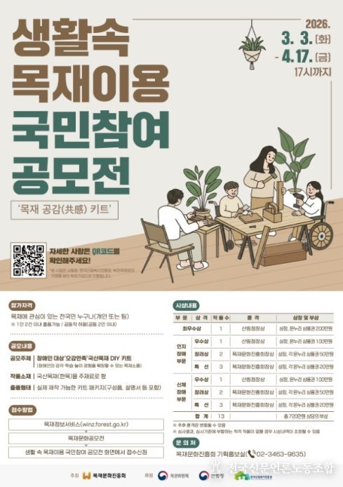 전국신문언론노동조합 강찬희 기자 | 산림청은 장애인 등 취약계층의 목재교육 기회 확대 및 생활 속 목재 이용 활성화를 위한 ‘생활 속 목재이용 국민참여 공모전-목재공감(共感)키트’를 4월 17일까지 개최한다고 5일 밝혔다.