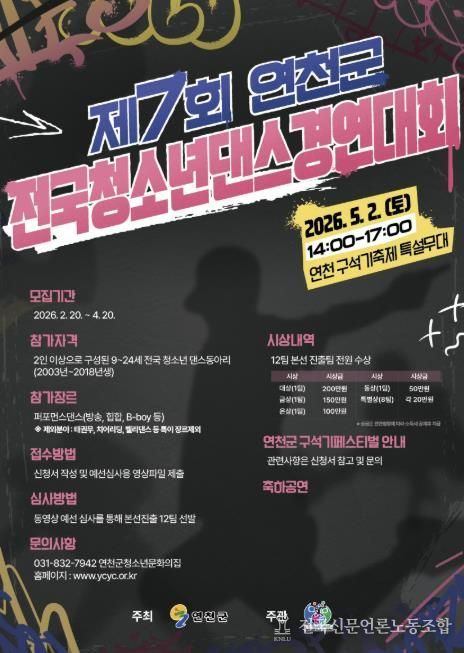 전국신문언론노동조합 김성길 기자 | (재)연천군청소년육성재단(청소년문화의집)은 전국 청소년들이 꿈과 열정을 마음껏 펼칠 수 있는 무대를 마련하고, 창의적인 문화예술 활동을 확산하기 위해 제7회 연천군 전국청소년댄스경연대회를 개최한다고 밝혔다.