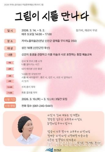 전국신문언론노동조합 강찬희 기자 | 신안군 저녁노을미술관이 지역의 자연과 일상을 예술로 풀어내는 주말 문화예술교육프로그램 ‘그림이 시를 만나다’를 오는 3월 14일부터 5월 2일까지 운영한다.
