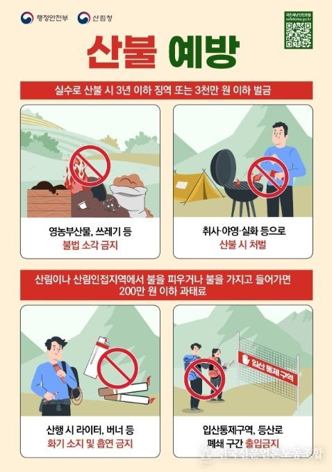 하종목 예방정책국장은 “올해는 건조한 날씨와 강풍 등으로 인해 예년보다 산불이 더욱 자주 발생하고 있다”라며, “작은 불씨 하나가 대형 산불로 이어질 수 있는 만큼, 국민 여러분께서는 그 어느 때보다 산불 예방에 적극 동참해 주시기 바란다”라고 말했다.