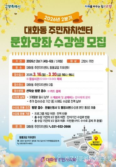 전국신문언론노동조합 김성길 기자 | 고양특례시 일산서구 대화동 주민자치회는 주민들의 문화적 욕구를 충족하고 삶의 질을 높이기 위해 오는 3월 16일부터 20일까지 ‘2026년 2분기 문화강좌’ 수강생을 모집한다.