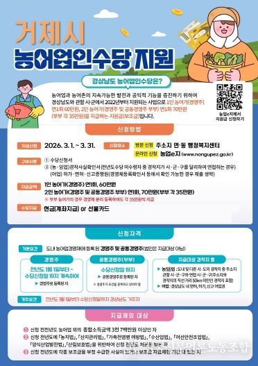 전국신문언론노동조합 강찬희 기자 | 거제시는 농어업·농어촌의 공익적 기능을 유지·증진하고 농어업인의 소득 안정을 지원하기 위해 ‘2026년 농어업인수당’ 신청을 3월 1일부터 3월 31일까지 접수하고 있다.