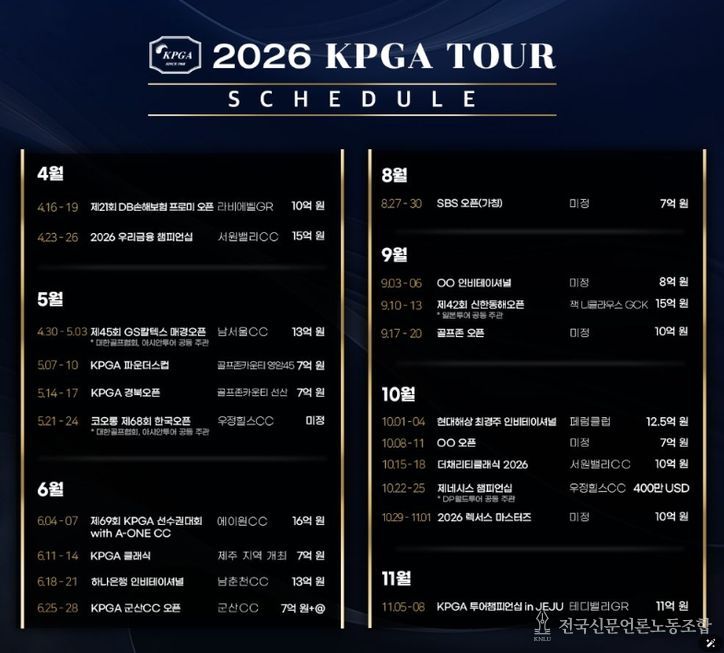전국신문언론노동조합 강찬희 기자 | ㈜한국프로골프투어(대표이사 김원섭, 이하 KPGT)가 3월 5일, 2026 시즌 KPGA 투어 일정을 발표했다.