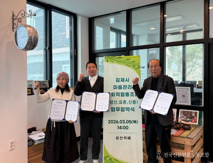 전국신문언론노동조합 강찬희 기자 | 김제시는 마을관리사회적협동조합 3개소가 지난 5일 상호 협력 강화를 위한 업무협약(MOU)을 체결하고 지역사회에 기반한 도시재생 상생 네트워크 구축에 나섰다고 밝혔다.