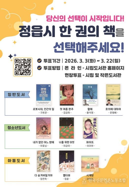 전국신문언론노동조합 강찬희 기자 | 정읍시가 시민이 함께 읽고 공감하는 독서문화 확산을 위해 2026년 ‘한 권의 책’ 선정을 위한 시민 투표를 오는 22일까지 온·오프라인으로 실시한다.