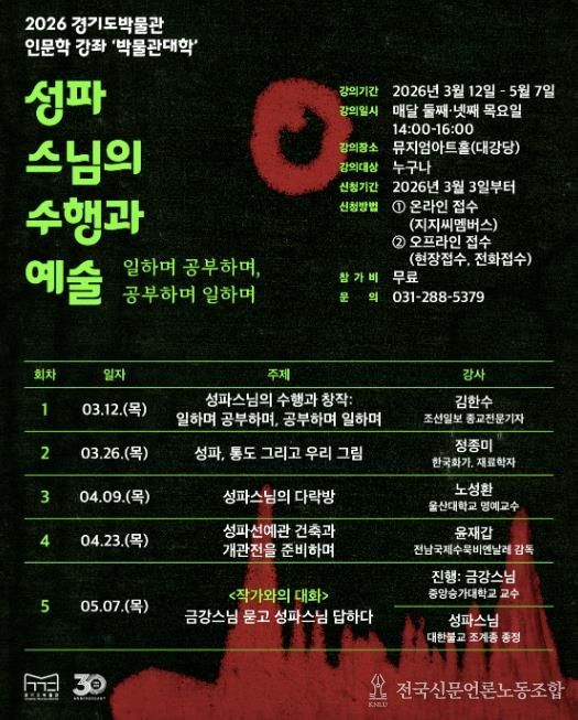 전국신문언론노동조합 김성길 기자 | 경기도박물관은 오는 3월 12일부터 ‘2026 경기도박물관 박물관대학(인문학 강좌)’을 운영한다. 경기도박물관 박물관대학(인문학 강좌)은 매년 역사·문화와 관련한 시의성 있는 주제를 선정해 도민에게 제공하는 교육프로그램이다.