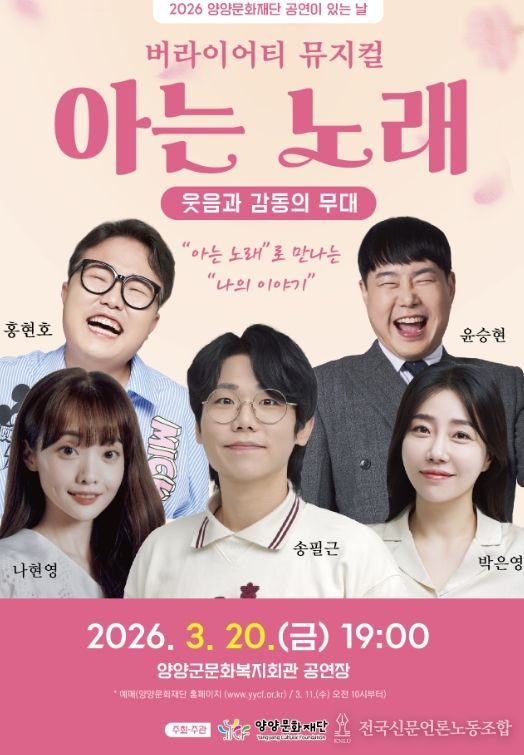 전국신문언론노동조합 강찬희 기자 | (재)양양문화재단이 2026년 새해 첫 공연으로 온 가족이 함께 웃고 즐길 수 있는 개그 뮤지컬 '아는 노래'를 오는 3월 20일 오후 7시 양양군 문화복지회관 공연장에서 개최한다.