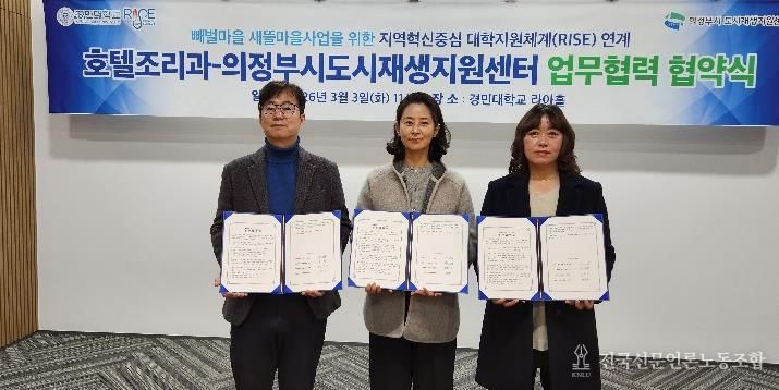 전국신문언론노동조합 김성길 기자 | 의정부시도시재생지원센터는 3월 3일 경민대학교 호텔조리과와 성공적인 빼벌새뜰마을사업을 위해 업무협약을 체결했다.