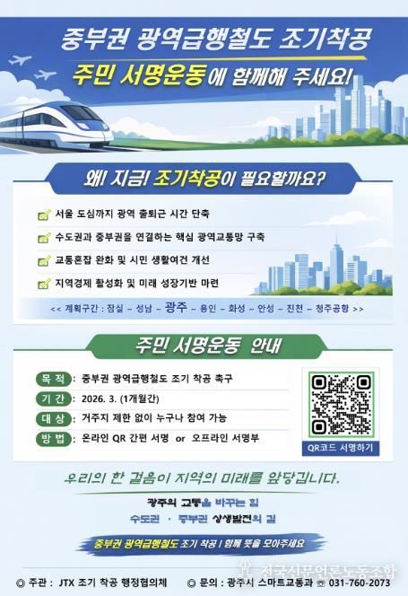 전국신문언론노동조합 김성길 기자 | 광주시는 중부권 광역급행철도의 조기 착공을 촉구하기 위해 3월 한 달간 주민 서명운동을 한다고 6일 밝혔다.