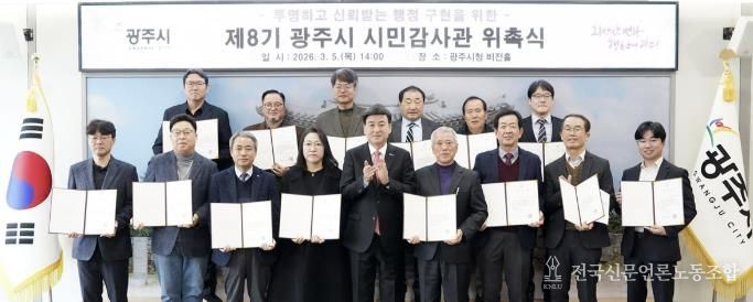 전국신문언론노동조합 김성길 기자 | 광주시는 지난 5일 시청 비전홀에서 제8기 시민감사관(명예감사관·전문감사관) 위촉식을 열고 앞으로 활동 방향을 공유했다.