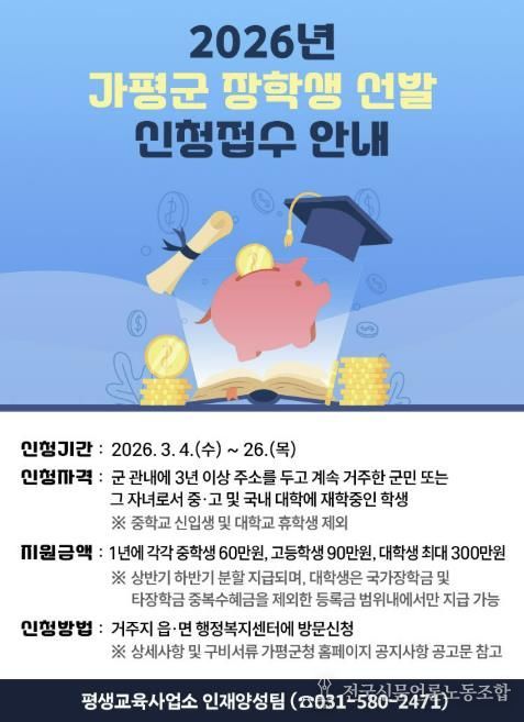 전국신문언론노동조합 김성길 기자 | 가평군이 지역 학생들의 균등한 교육 기회를 보장하고 우수 인재를 육성하기 위해 2026년도 장학생 선발에 나선다.