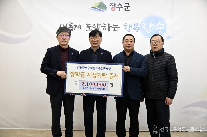 전국신문언론노동조합 강찬희 기자 | (재)장수군애향교육진흥재단(이사장 최훈식)은 장수군개인택시단위조합(조합장 정춘원)이 5일 군청을 찾아 장학금 210만원을 기탁했다고 밝혔다.