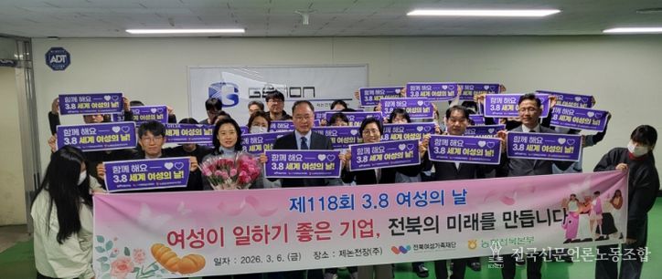 전국신문언론노동조합 강찬희 기자 | 전북특별자치도는 6일 제118회 세계 여성의 날을 맞아 전북여성가족재단, 농협중앙회 전북본부와 함께 여성친화기업 제논전장㈜를 방문해 여성 근로자들을 격려하고 성평등 조직문화 확산을 위한 기념행사를 개최했다.