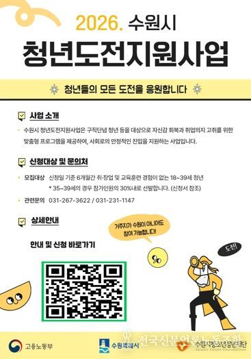 전국신문언론노동조합 김성길 기자 | 수원시청소년청년재단 수원시청년지원센터는 취업 준비 과정에서 어려움을 겪고 있는 청년을 대상으로 ‘2026 수원시 청년도전지원사업’ 참여자 130명을 모집한다고 6일 밝혔다.