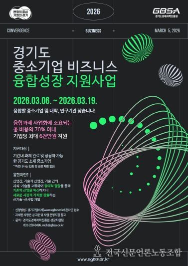 전국신문언론노동조합 강찬희 기자 | 경기도와 (재)경기도경제과학진흥원이 도내 중소기업의 혁신 성장과 새로운 비즈니스 모델 발굴을 돕는 ‘2026년 중소기업 비즈니스 융합성장 지원사업’의 참여기업을 모집한다.