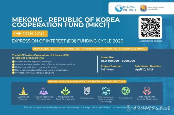 전국신문언론노동조합 강찬희 기자 | 외교부는 3월 6일부터 4월 10일까지 제10차 한-메콩 협력기금(MKCF, Mekong-Korea Cooperation Fund) 사업 선정 공모를 진행한다.