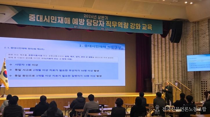 전국신문언론노동조합 강찬희 기자 | 구미시는 '중대재해 처벌 등에 관한 법률'에 따른 중대시민재해 예방 역량을 높이기 위해 지난 6일 시청 대강당에서 관련 업무 담당자 30여 명을 대상으로 실무교육을 실시했다.