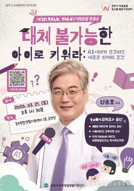 전국신문언론노동조합 강찬희 기자 | 원주시 아동돌봄 원스톱통합지원센터는 오는 21일 오후 1시 30분, 동부복합생활지원센터 공연장에서 초등학생 자녀 양육에 대한 고민을 나누고 해결 방안을 모색하는 ‘제3회 톡톡! 부모상담 토크쇼’를 개최한다.