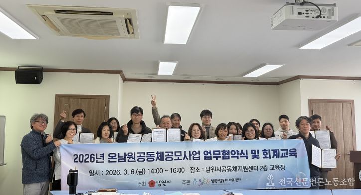전국신문언론노동조합 강찬희 기자 | 남원시공동체지원센터(센터장 안상연)는 지난 6일, ‘온남원공동체 공모 사업’에 선정된 13개 팀과 원활한 사업 추진과 향후 협력 증대를 위한 업무협약을 체결했다. 이날 협약식은 본격적인 사업 시작에 앞서 선정된 공동체들을 소개하고, 사업 운영 및 예산 사용에 관한 실무 교육을 병행하며 내실 있게 진행됐다.