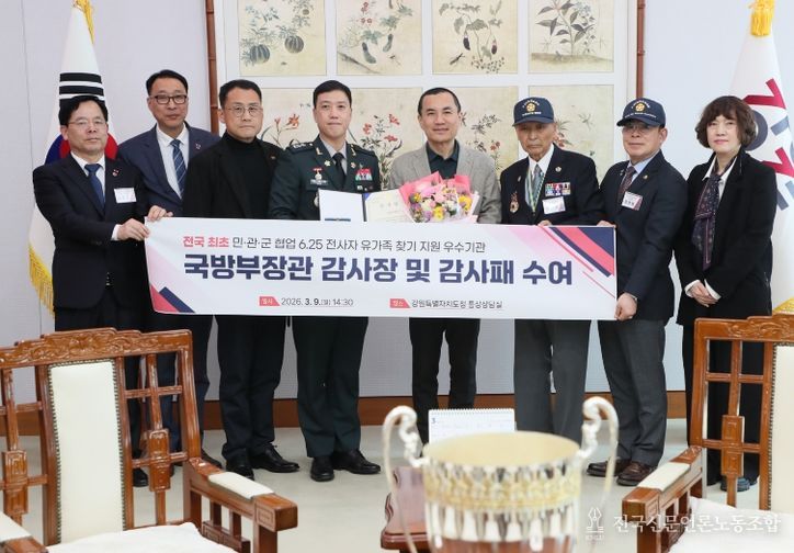 전국신문언론노동조합 강찬희 기자 | 강원특별자치도는 국방부 유해발굴감식단이 추진한 ‘2025년 민·관·군 협업 6·25전사자 유가족 집중 찾기’ 사업에서 전국 최초 민관군 협업 6.25전사자 유가족 찾기 지원 우수기관으로 선정돼, 3월 9일 국방부장관으로부터 감사장과 감사패를 수상했다고 밝혔다.