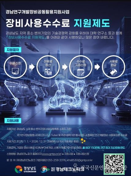 전국신문언론노동조합 강찬희 기자 | 경상남도는 연구개발장비의 공동활용을 활성화하고 도내 기업의 기술경쟁력 강화를 위해 ‘2026년 연구개발장비 공동활용지원사업’을 시행한다고 밝혔다.