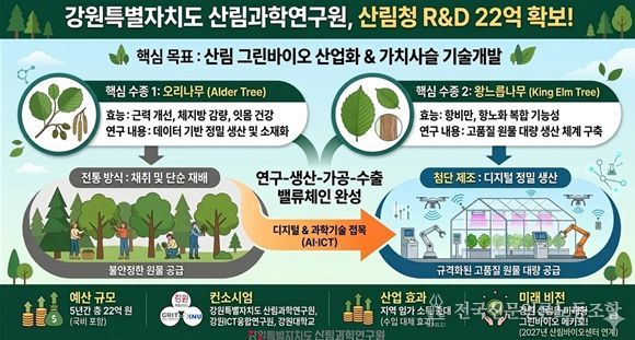 전국신문언론노동조합 강찬희 기자 | 강원특별자치도 산림과학연구원은 산림청이 주관하는 ‘산림분야 그린바이오 미래형 가치사슬 기술개발’ 공모사업에 최종 선정돼 5년간 총 22억 원의 국비를 확보했다고 밝혔다.