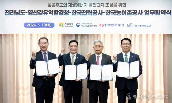 전국신문언론노동조합 강찬희 기자 | 전라남도는 10일 한국전력공사 회의실에서 한국전력, 한국농어촌공사, 영산강유역환경청과 공공 주도 재생에너지 발전단지 조성과 안정적 전력 공급을 위한 업무협약을 했다.