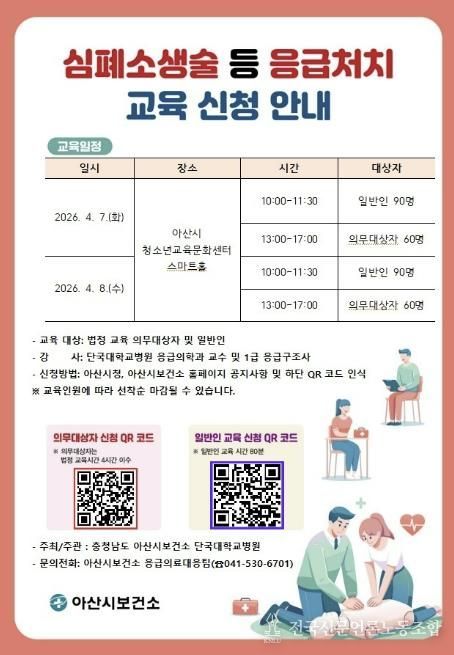 교육 신청은 아산시청과 아산시보건소 홈페이지 공지사항의 ‘2026년 심폐소생술 등 응급처치 교육 안내’에서 확인할 수 있다.