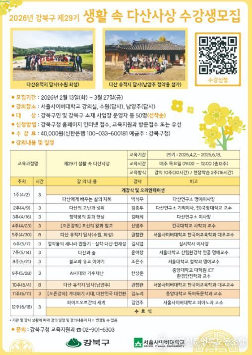 전국신문언론노동조합 강찬희 기자 | 서울 강북구는 다산 정약용의 사상과 인문학적 가치를 생활 속에서 쉽게 접할 수 있도록 '제29기 생활 속 다산사상' 수강생을 모집한다고 밝혔다.