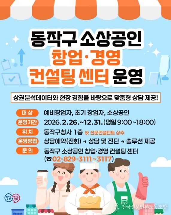 전국신문언론노동조합 강찬희 기자 | 동작구가 지난 3일부터 전국 기초지자체 최초로 관내 소상공인을 위한 창업·경영 컨설팅 센터를 직영 운영한다고 밝혔다.