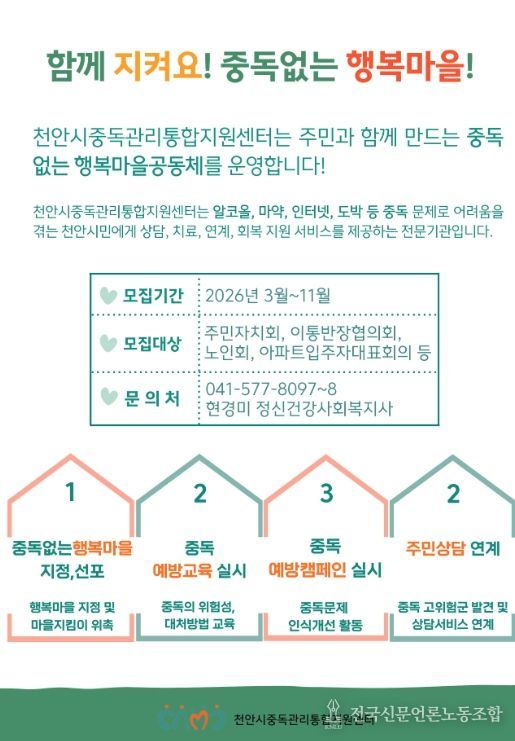 전국신문언론노동조합 강찬희 기자 | 천안시중독관리통합지원센터는 올해 ‘함께 지켜요! 중독없는 행복마을’ 사업을 확대 추진한다고 11일 밝혔다.