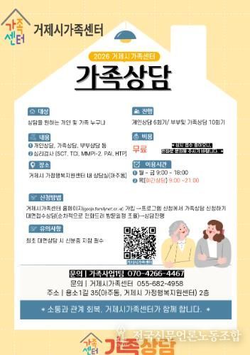 전국신문언론노동조합 강찬희 기자 | 거제시가족센터는 생애주기에 따라 나타나는 가족 내 다양한 갈등과 문제 해결을 지원하기 위해 개인상담, 부부상담, 가족상담, 부모-자녀상담, 집단상담 등을 운영하고 참여자를 상시 모집한다고 밝혔다.
