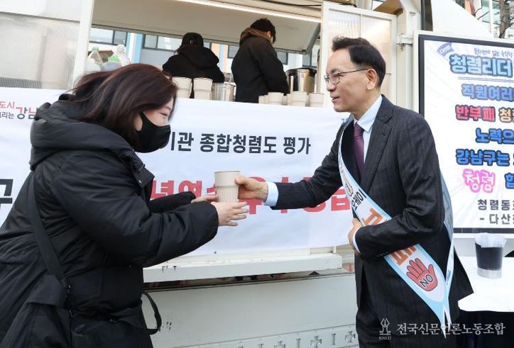 전국신문언론노동조합 강찬희 기자 | 꿈이 모이는 도시, 미래를 그리는 강남구가 3월 11일 구청에서 ‘여러분 덕분입니다’ 청렴캠페인을 진행했다. 2025년 공공기관 종합청렴도 평가에서 3년 연속 청렴 우수등급을 달성한 것을 기념하고, 반부패·청렴 실천 의지를 다시 다지기 위해 마련한 행사다.
