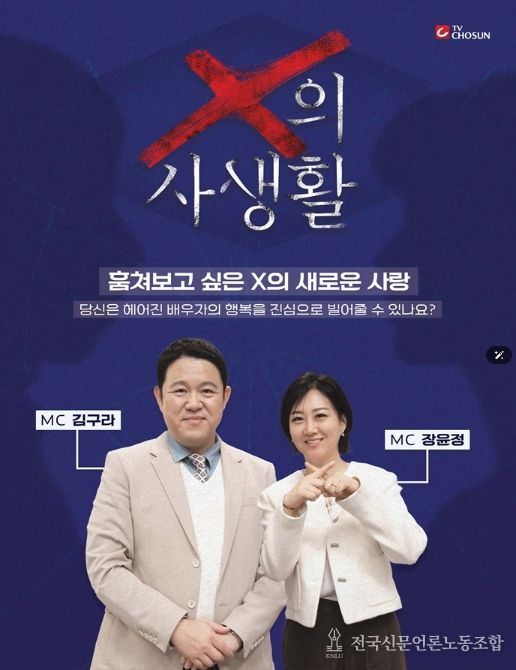 오는 3월 17일(화) 밤 10시 첫 방송되는 TV CHOSUN ‘X의 사생활’은 이혼한 전 배우자의 일상을 지켜보는 리얼 관찰 프로그램이다. 한때는 누구보다 가까웠지만 이제는 ‘남보다 못한 사이’가 된 두 사람이 각자의 삶을 살아가는 모습을 통해 관계가 끝난 뒤에도 남아 있는 감정과 변화의 과정을 담는다. 일명 ‘이혼 부부들의 입장 정리 리얼리티’로, MC 김구라와 장윤정을 중심으로 패널 천록담, 정경미가 합류해 환상의 라인업을 완성했다.