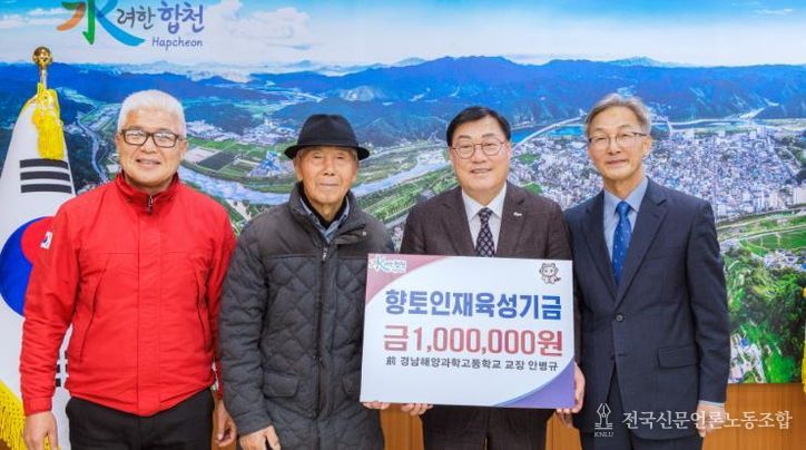 전국신문언론노동조합 강찬희 기자 | 前 경남해양과학고등학교 교장 안병규는 10일 (재)합천군인재육성재단을 방문하여 향토인재육성기금 100만원을 기탁했다.