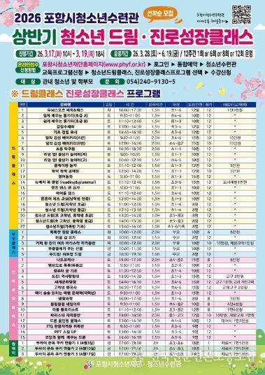 전국신문언론노동조합 강찬희 기자 | 포항시청소년재단 청소년수련관은 청소년들의 흥미와 적성을 발견하고 진로 역량을 강화하기 위한 ‘2026년 상반기 청소년 드림·진로성장 클래스’ 수강생을 모집한다.