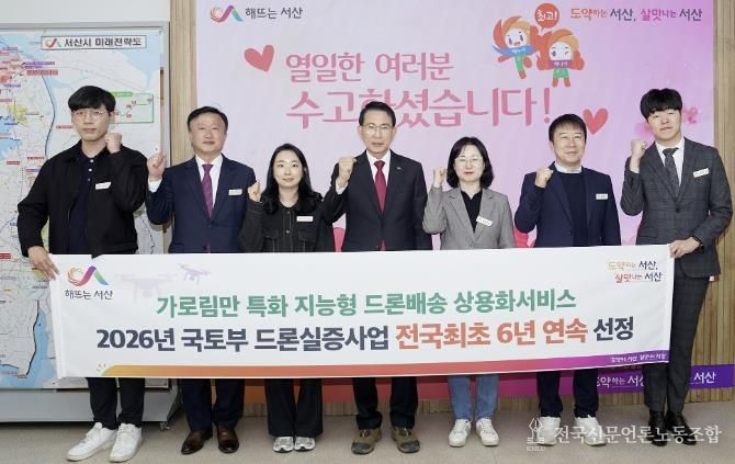 전국신문언론노동조합 강찬희 기자 | 충남 서산시는 국토교통부와 항공안전기술원이 주관하는 2026년 드론 실증도시 구축사업 공모에 전국 최초로 6년 연속 선정됐다고 밝혔다.
