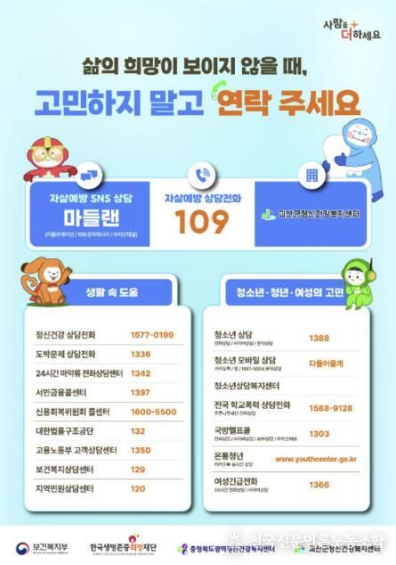 주요 추진 내용은 △자살예방 상담전화 109 △자살예방 캠페인 운영 △생명지킴이 양성교육 △찾아가는 심리지원서비스 △생명사랑안심마을 조성 등이다.