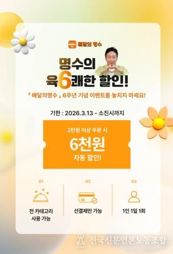 군산시는 3월 13일부터 예산 소진 시까지 ‘배달의명수’ 6주년 기념 ‘육(6)쾌한 할인’ 이벤트를 진행한다고 밝혔다.