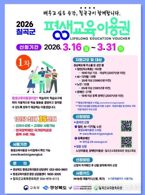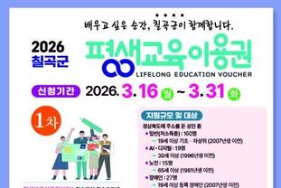 전국신문언론노동조합 강찬희 기자 | 칠곡군은 저소득층, 노인, 장애인 등 교육 소외계층 221명을 대상으로 ‘2026년 평생교육이용권’ 지원사업을 추진한다.