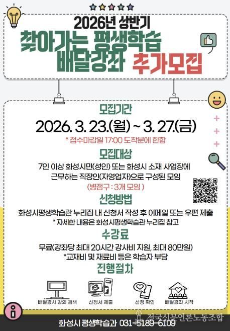 전국신문언론노동조합 김성길 기자 | 화성특례시는 시민의 다양한 학습 수요를 반영한 맞춤형 평생학습 프로그램 운영을 위해 ‘2026년 상반기 찾아가는 평생학습 배달강좌’를 추가 모집한다고 밝혔다.