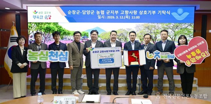전국신문언론노동조합 강찬희 기자 | 순창군과 담양군 농협군지부는 12일 고향사랑기부금 총 1,002만원을 상호기부하는 전달식을 가졌다.